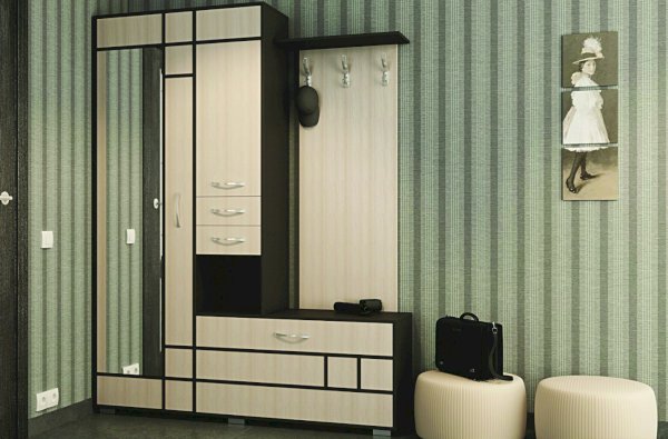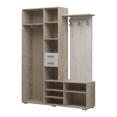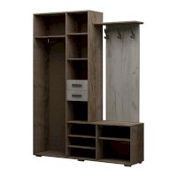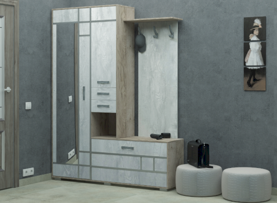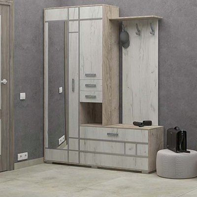 Состоит из полки с крючками, тумбы и шкафа с выдвижной штангой.