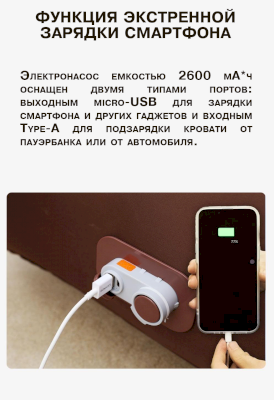 Электронасос емкостью 2600 мА*ч оснащен двумя типами портов: выходным micro-USB для зарядки смартфона и других гаджетов и входным Type-A для подзарядки кровати от пауэрбанка или от автомобиля.