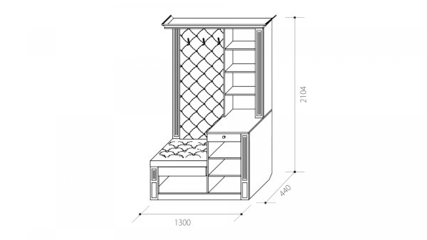 Наполнение: крючки для одежды + ниша для обуви + 2 распашных шкафа с полками + выдвижной ящик