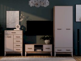 Двухстворчатый шкаф «Скандика» выполнен из качественной ЛДСП в оттенках дуб смоки/кашемир. Матовые фасады практичны в использовании. Модель состоит из нижнего выкатного ящика, двух распашных дверок, за которыми находится отделения с хромированной штангой, вместительная верхняя полка и встроенный блок с двумя дополнительными полками. Створки плотно фиксируются на магнитах.