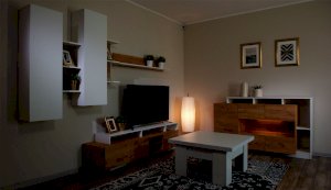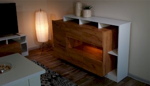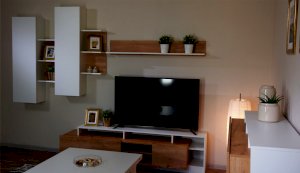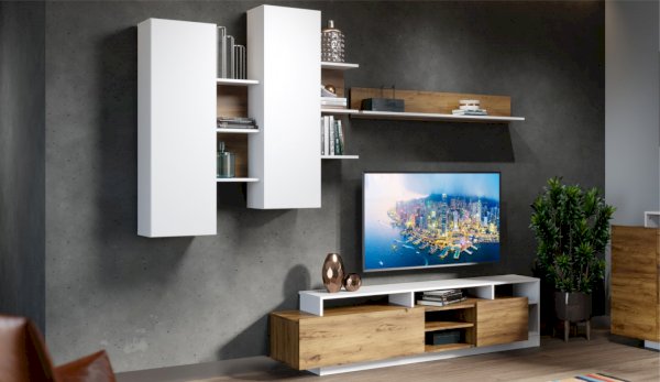 Стенка Невио-2 выполнена с использованием новейшего декора «Дуб крафт золотой» в сочетании с белым - подходит для стилистических направлений лофт, минимализм, скандинавский. Простые формы, естественные природные оттенки создают гармоничную и умиротворенную атмосферу гостиной. Четкая текстура дерева, белый цвет, отсутствие внешней фурнитуры, углубленный цоколь - создают визуальную легкость и компактность стенки. Фасады, выступающие на 1см поверх корпуса, заменяют ручки. Стенку дополняет вместительный комод с витриной. Мебель выполнена из высококачественных экологичных материалов.