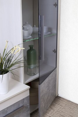 В тени. Фасады витрин мебельной коллекции ЛЕОН выполнены из тонированного серого стекла. Сдержанный и благородный оттенок соответствует всем свежим тенденциям интерьерного дизайна. Поэтому к гостиной ЛЕОН так легко подобрать современные светильники и аксессуары для дома.