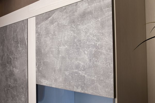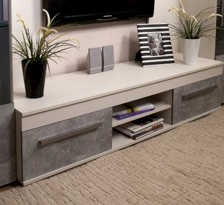 Брутальная эстетика. Законодатели интерьерных тенденций “сдали” бетону кухню, ванную, облицовку стен и пола, а теперь уже и мебель для других комнат. Особенно гармонично материалы “под бетон” выглядят в лофтах - популярных однокомнатных планировках недорогих квартир, ориентированных на молодую аудиторию. Спокойный и мужественный “бетонный” декор Ателье Светлый на фасадах стенки ЛЕОН облечен в раму из древесного декора Ясень Анкор светлый.