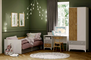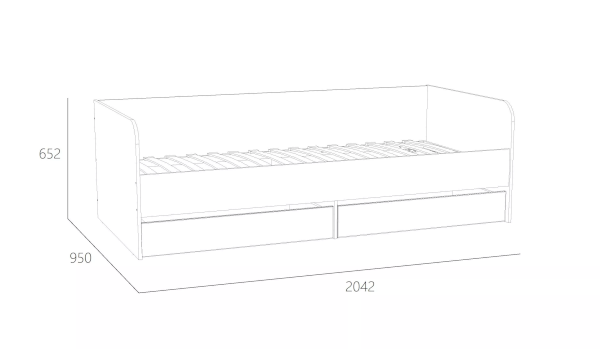 Односпальная кровать подходит для детской мальчиков и девочек в современном, скандинавском и стиле лофт. В кровати предусмотрены ящики для хранения постельного белья или игрушек. Натуральный материал ламелей не вызывает аллергии и безопасен для здоровья. Изогнутая форма ламелей придает основанию спального места большую прочность и дополняет ортопедические свойства матраса.