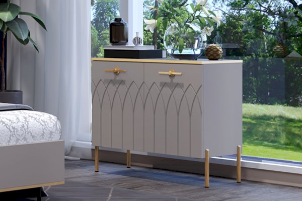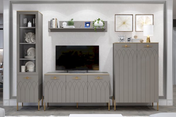 Купить комод в гостиную в современном стиле – практичное решение для вашего дома. Модуль создан не только для хранения, но и несомненно украсит пространство вашей спальни или гостиной. Сочетание мягкого серого оттенка силк анис, яркой золотой фурнитуры и кромки создает неповторимый образ респектабельной мебели.
